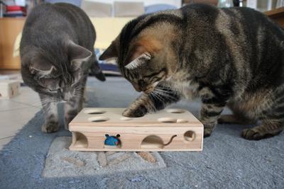 Le prototype qui a été réalisé est quotidiennement utilisé par 2 matoux bienheureux depuis 2012. Chacun a développé sa technique favorite pour attraper sa nourriture. L'un l'attrape par les trous du bas alors que l'autre chat préfère s'asseoir sur la boîte et pousser les croquettes par les trous du haut ! Votre chat trouvera lui aussi sa propre façon de récupérer la nourriture.